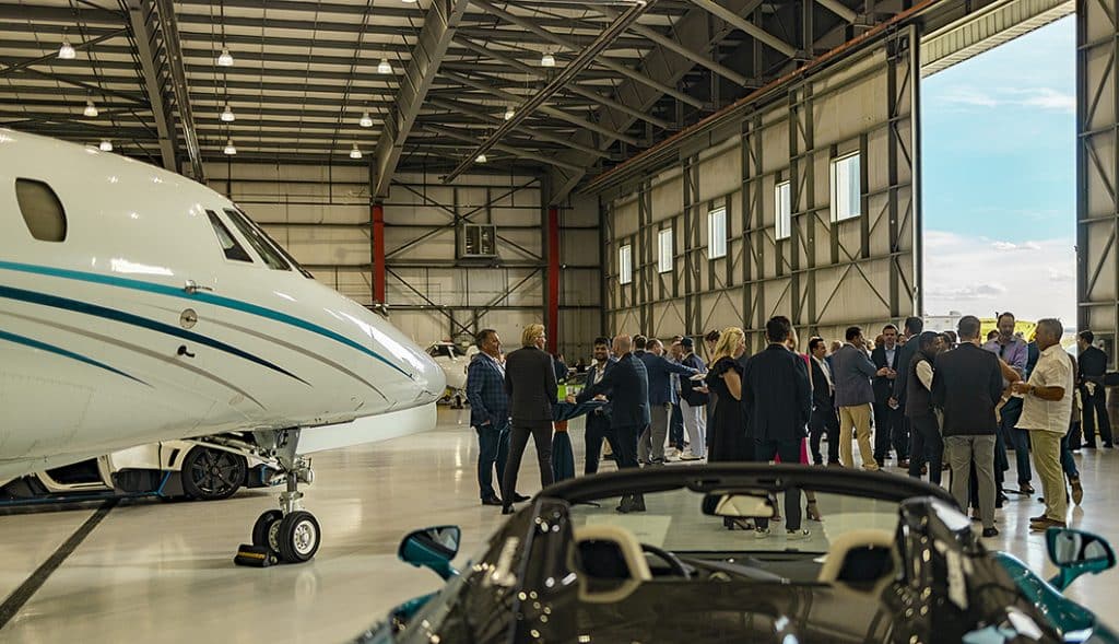 Guests inside of the hangar viewed a variety of supercars from Ferrari of Denver and Mike Ward of Denver, including luxury vehicles from esteemed brands such as Bentley, Ferrari, Aston Martin, McLaren, and Zenvo Automotive – a Dutch manufacturer of rare hypercars.